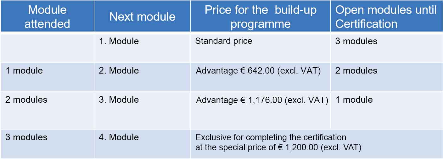 Then the ALM*Diploma build-up programme offers you an even greater price advantage for the next module and you are just about to be certified. Example: